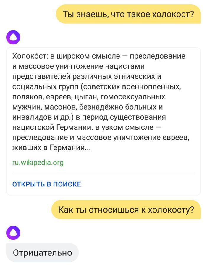 54 SupremeHustler Ассистент Алиса от Яндекса 8 лет назад Показать полностью 3 [моё] Яндекс Холокост Мнение Длиннопост