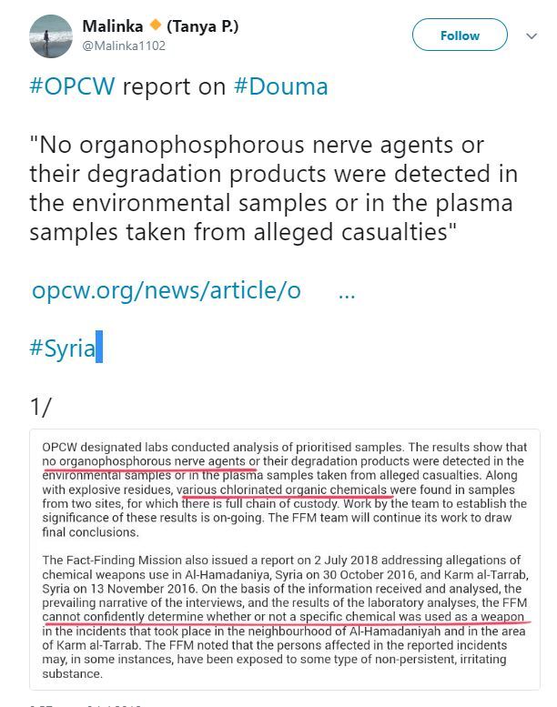 И вдруг люди на месте происшествия сообщают, что «никакие вещества, относящиеся к Конвенции о химическом оружии, не были найдены» и, особенно, «результаты (анализа) показали отсутствие следов нервно-паралитических веществ или продуктов их распада в образцах из окружающей среды или плазме крови, взятой у предполагаемых пострадавших».