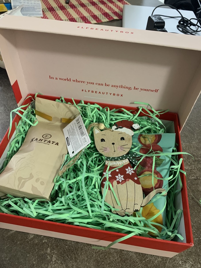 Коробка б/у от косметики, чай, конфеты и игрушка. И мне так грустно стало. Дело ведь не в материальной ценности, а в том, что делается вот так, абы как, вроде и смотрится неплохо и всё приличия соблюдены, а по итогу только грусть.