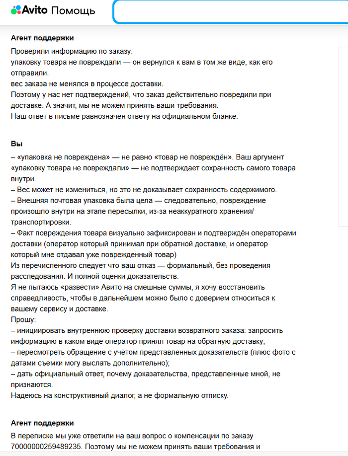Однако Avito отказались даже частично компенсировать ущерб, заявив, что “упаковку товара не повреждали” и “вес заказа не менялся в процессе доставки”, что, по их мнению, свидетельствует о сохранности товара.
