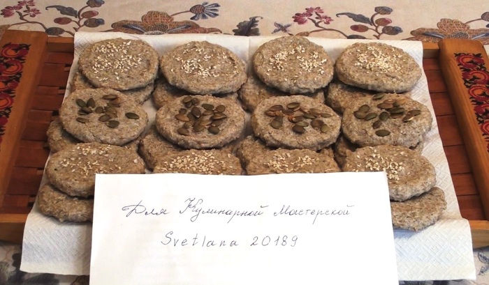 растительного масла. Затем - ~180 гр. кукурузной муки. Следом - ~180 гр. рисовой муки. Далее - ~50 гр. льняной муки. В завершении - 50 гр. кунжута.