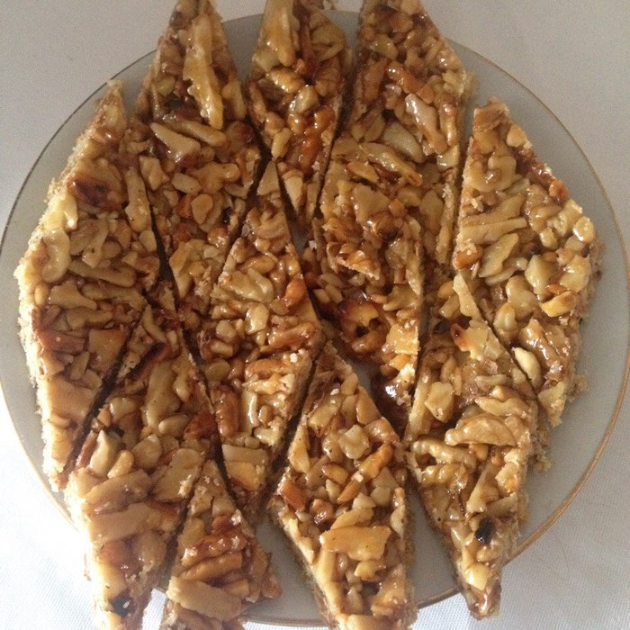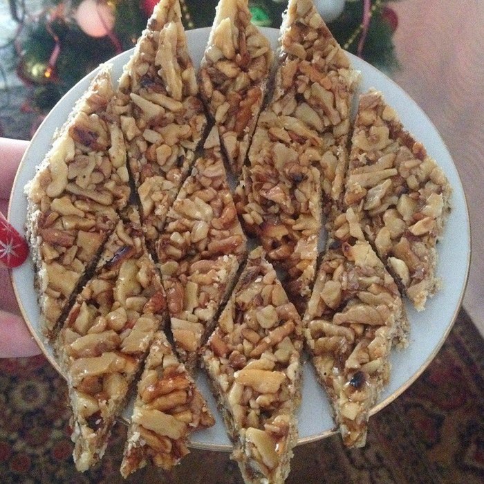 Итак,на новый год трационно готовят Гозинаки, именно так произносится,от слова Нигози - Орехи. Грецкие орехи режут и обжаривают на сковороде. В кастрюле немного проваривают мед, и добавляют орехи.Главное что бы не получилось так что меда слишком много,а орехов мало,масса должна быть плотной.Далее выкладывают на ровную поверхность,после застывания режут на кусочки. Очень вкусно получается , и за новогодние праздники можно вдоволь насладиться на целый год.