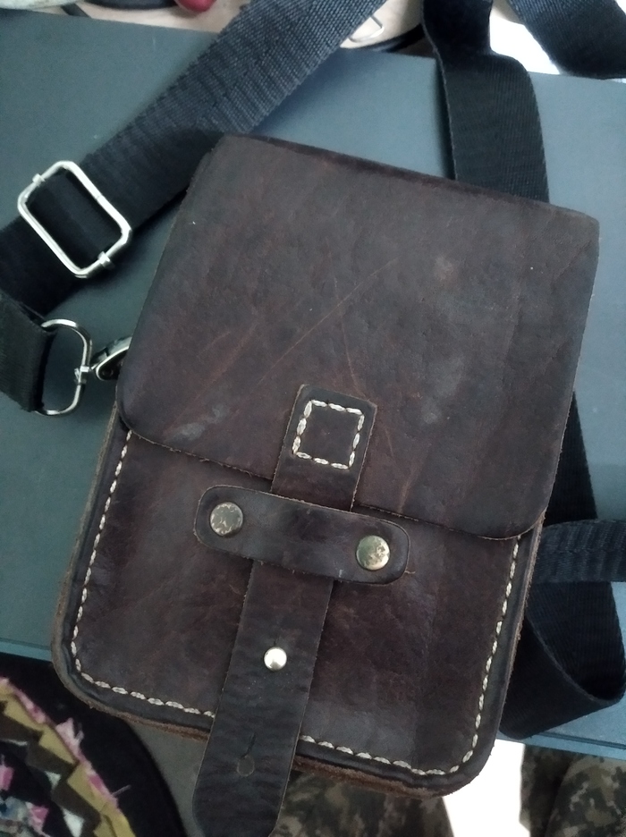 Всем здоровья. Как то выбрал время и сшил себе сумочку для телефона и документов. Кожа "чепрак".Другой не было. Живу в деревне в конце географии Казахстана. Сделал из того что было под рукой. Специализированных магазинов у нас не имеется. И завидую тем кто может сходить и купить в магазине. До Алика только дошел. Да и то посоветовали. Хочу попробовать с крейзи хорс поработать.