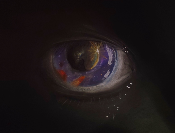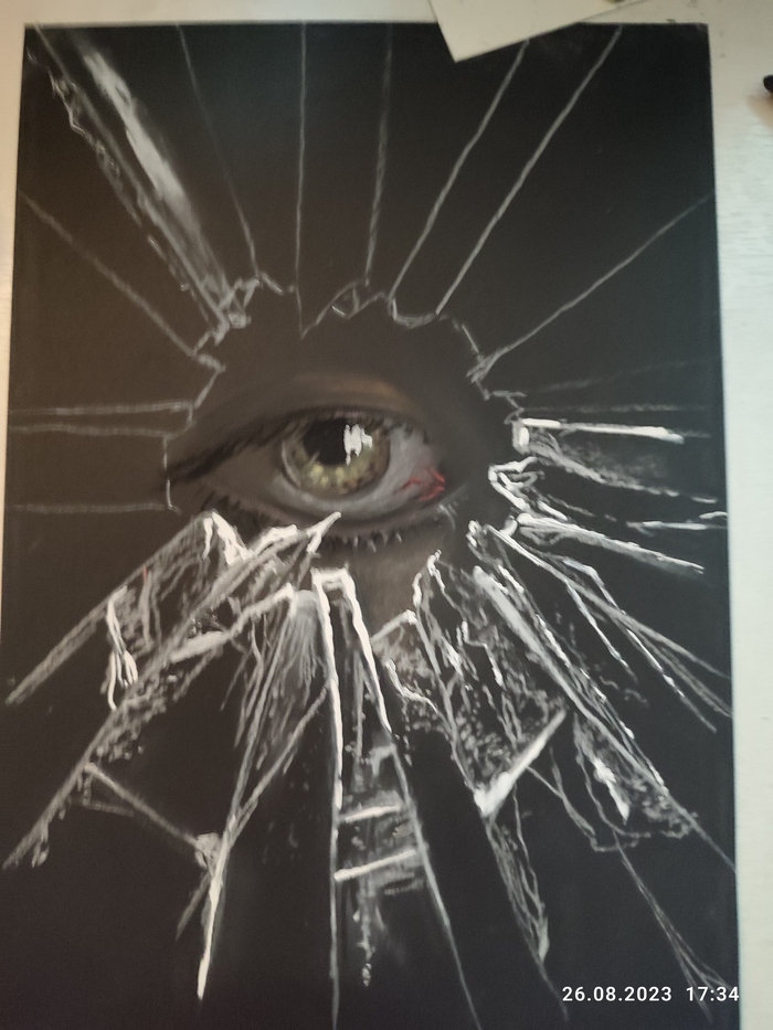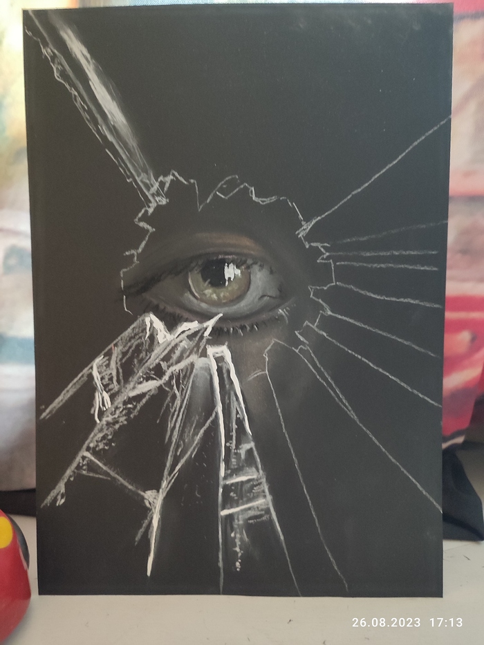 Сначала появилась мысль попробовать нарисовать битое стекло. На это вдохновили работы художника и скульптора Саймона Бергера. Затем стала думать над самой идеей. Битое стекло - олицетворяет ощущение, что все вокруг рушится и разбивается ( у каждого были такие моменты в жизни). И хороший способ выйти из подобного состояния - посмотреть на ситуацию со стороны, отрешённо, как сторонний наблюдатель. Если вкратце, так возникла идея этой работы. К слову сказать, очень люблю рисовать глаза и взгляды, что тоже сыграло свою роль.