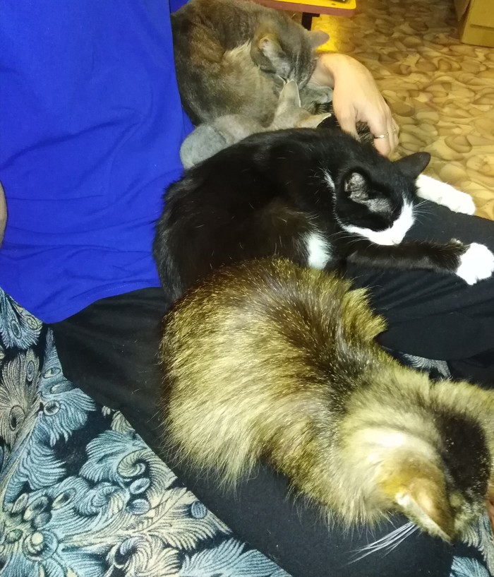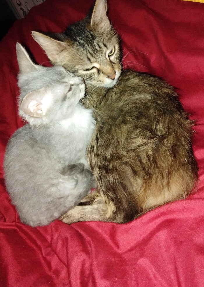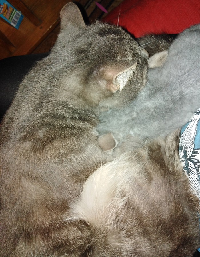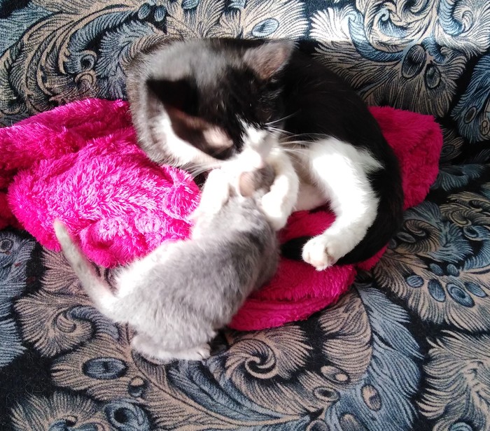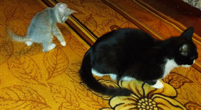 С Рысей (в быту Сися). Так вот эта волосатая дама только не давно приняла её. Начала активно за ней ухаживать. Подпускать к себе. Мелкая с первых дней за ней бегала, но Сисин её игнорила.