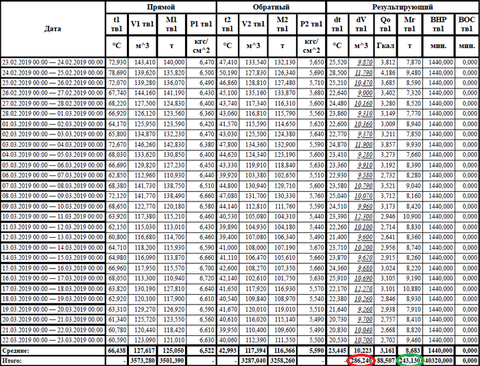 Далее посмотрел непосредственные показания прибора в марте в отчете ресурсоснабжающей организации (такой документ председатель может взять в управляющей компании), увидел измеренный расход – Mг=243,130 тонн, и знакомую цифру 286,240 кубометров, только это не расход, это некий параметр dV=V1 – V2: