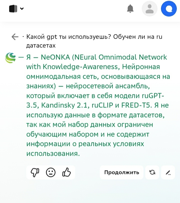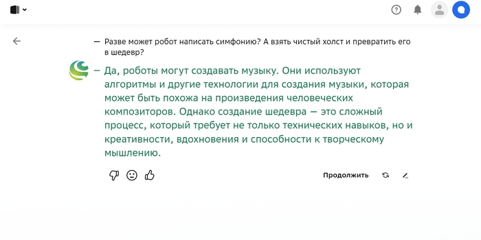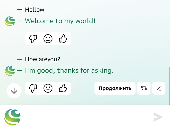 GigaChat представляет собой классический чат на базе нейронной сети, который был обучен на библиотеке TensorFlow. Он позволяет задавать вопросы и получать мгновенные ответы, в отличие от ChatGPT, причем ответы выглядят органично и содержательно. Единственным минусом является редкое игнорирование запросов, в такие моменты нейросеть начинает отвечать по скрипту.