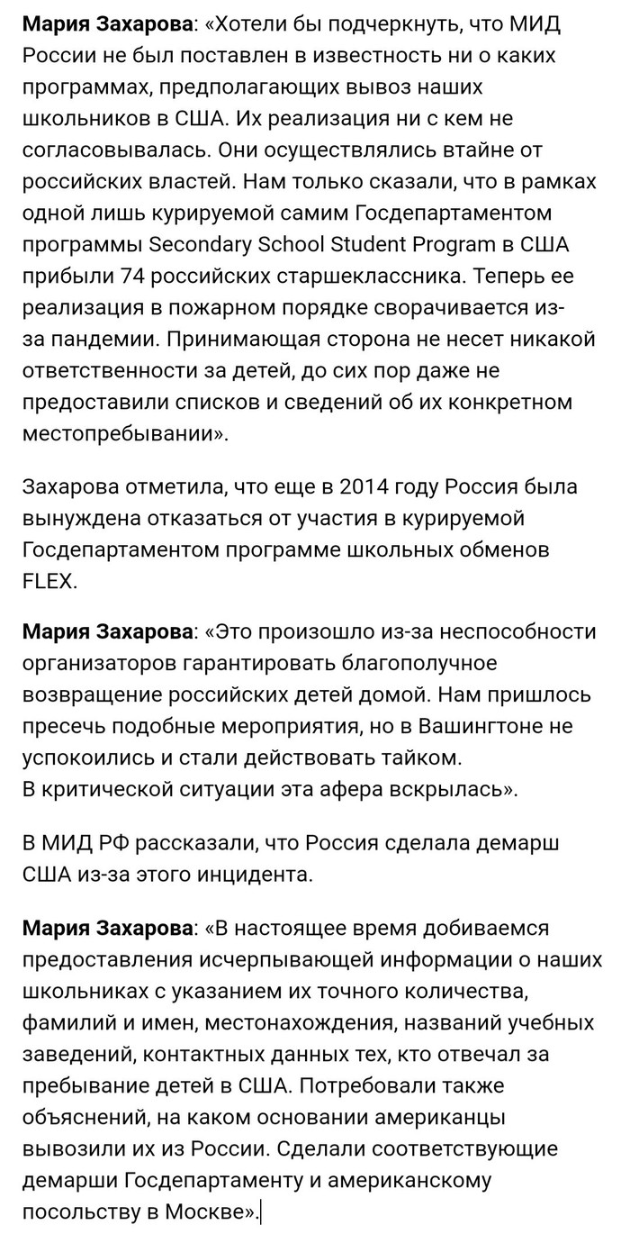 74 старшеклассника из России(будущие навальные и коли с уренгоя) оказались в США в разгар пандемии. Оказалось, туда они попали без согласования с МИД РФ. Всё потому, что они в США тайком проходили спецпрограмму, курируемую Госдепом. Программу спешно свернули и заявили: "Забирайте своих школьников!"