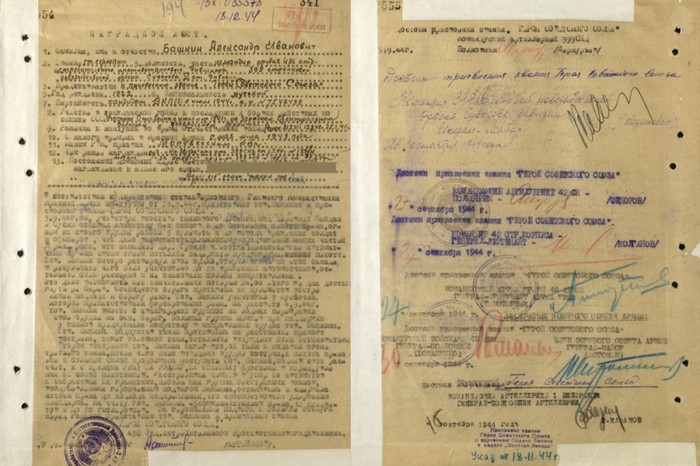 Старший сержант Башкин является самым смелым и отважным в бою, — говорится в представлении к ордену. — 22.06.44 в период атаки нашей пехоты его орудие уничтожило 2 дзота, одно 37-мм орудие, три пулеметных точки, что дало возможность нашей пехоте идти вперед.