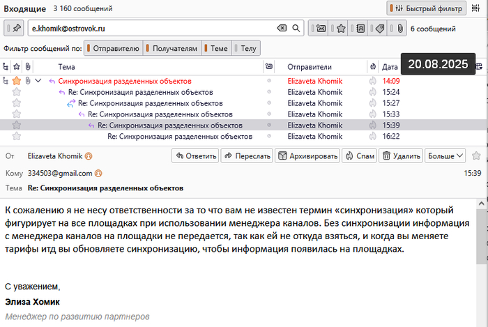 В общем они что то подкрутили, причем сделали это ужасно, у нас все было настроено, каждый номер настраивается индивидуально, там есть кол-во мест, кол-во кроватей(разные понятия) и т.д. фотографии наполнения, описания. Они просто взяли наименования, создали объект, запихали туда фотки и как бы все! А дальше идите в пешее эротическое к своему менеджеру каналов. Я даже скриншот приложу где мне открыто пишут ты "тупой" не понимаешь что такое синхронизация. Хотя настроенный канал по умолчанию "синхронизирован", что она пыталась донести до меня, тыкая мне "синхронизацией", я до сих пор не понимаю. И на все мои потуги узнать подробнее как это делается меня откровенно посылали. В других агрегаторах мне вообще через anyDesk за 3 минуты все сами сделали, я только смотрел.