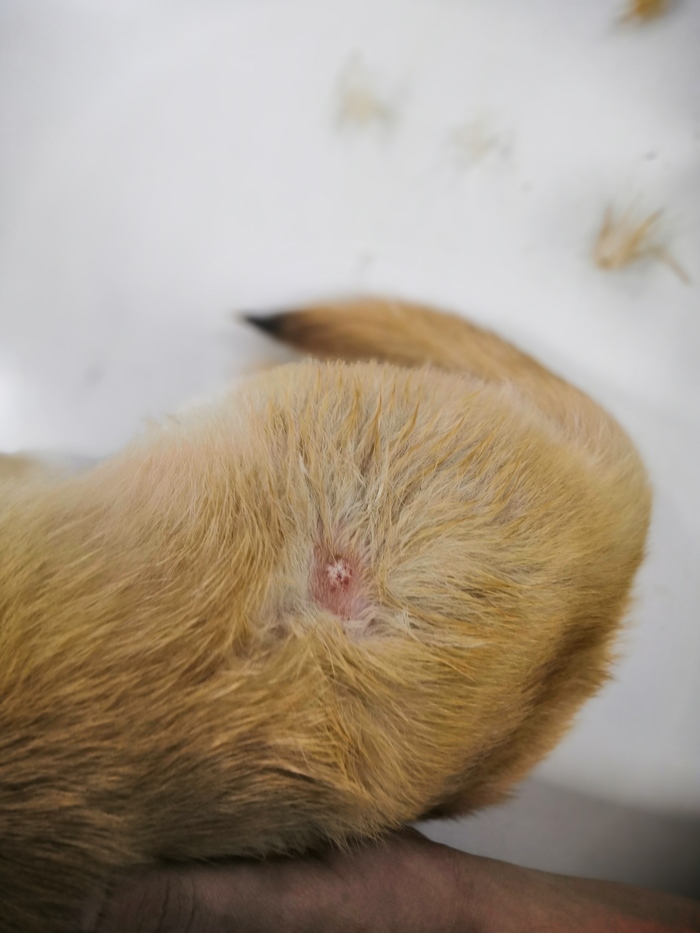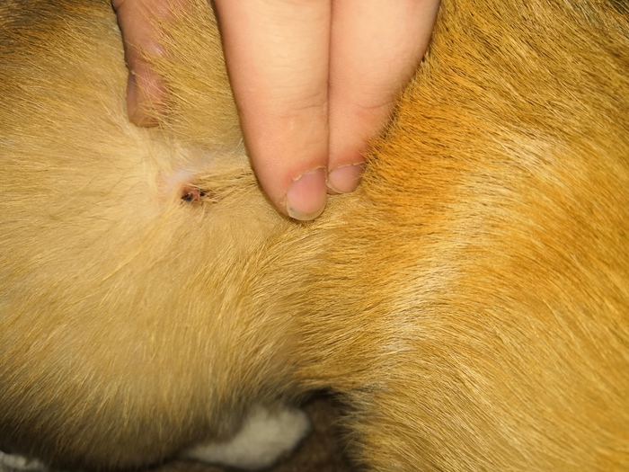 Как только я был дома и увидел это - решено было ехать к ветеринару (да, я паникер). Ветеринар посмотрел, сбрили шерстку, очистили, стало видно следующее: