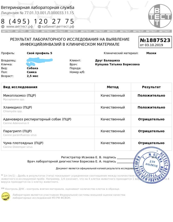Данных анализов у меня на руках не было, сходил на следующий день, мне их переслали на почту, отправил заводчице, на что получил следующий ответ: