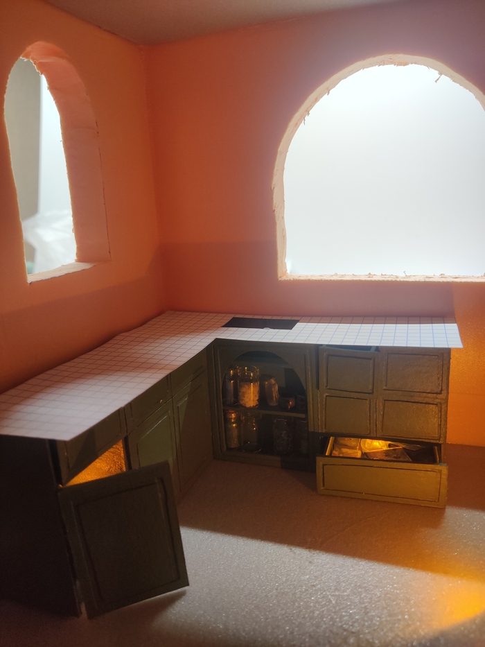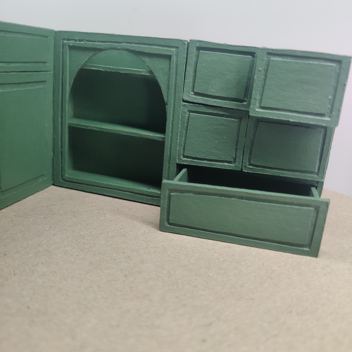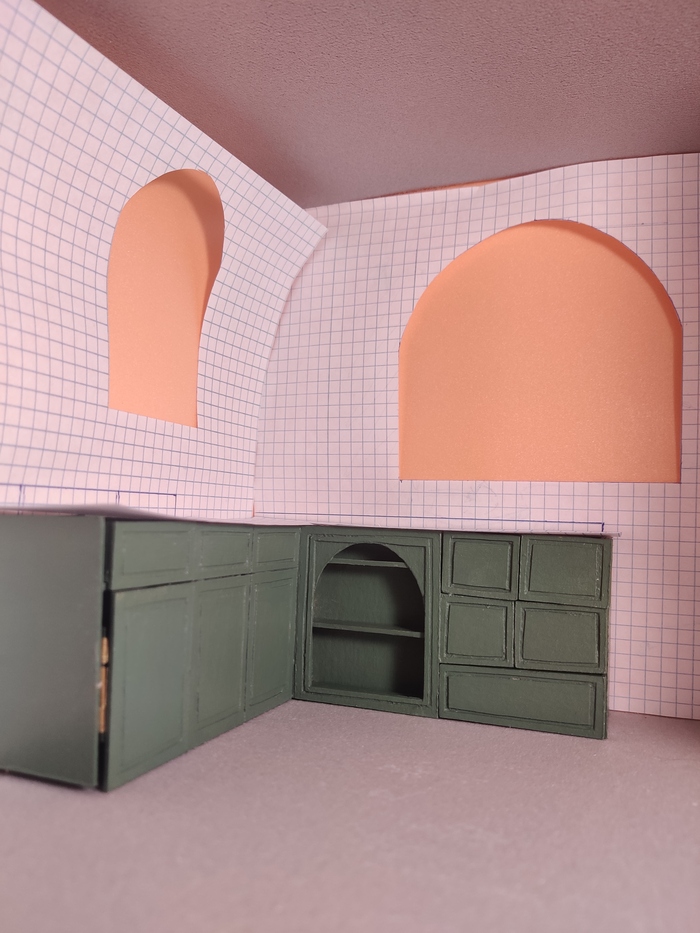 Потом ещё буду доделывать столешницу с раковиной и интересные ручки, а пока отталкиваясь от самой большой мебели в комнате прорезаю окна.