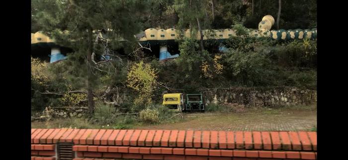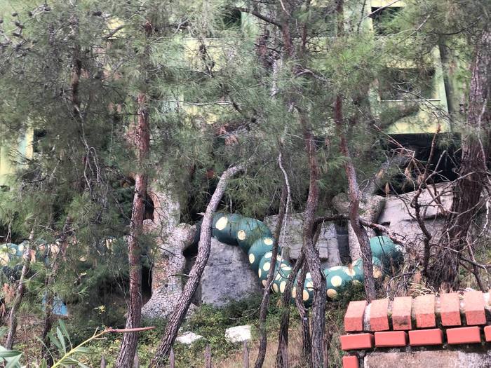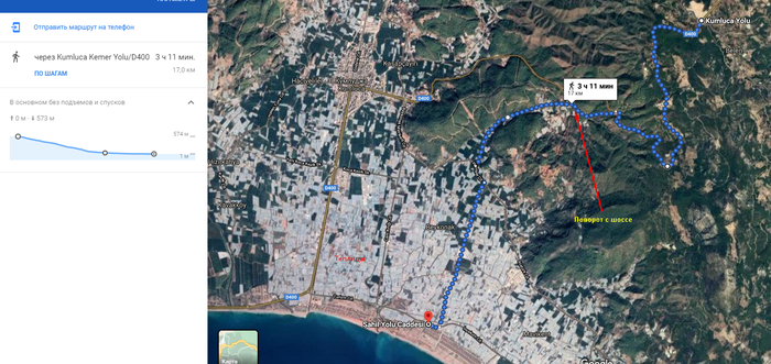 Проснувшись в Кемере мы собрались и двинулись по лесной дороге в сторону Текирова. По лесной дороге одолели первый подъём, далее дорога идёт вдоль садов и деревенских домиков. Проехав через Чамьюва, мы увидели известный заброшенный отель ( Holiday Area Eco Dream Club Sea Resort,). Издалека он похож на парк аттракционов, вид громадных декораций очень не обычный.