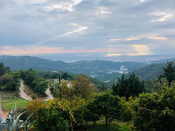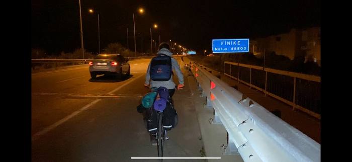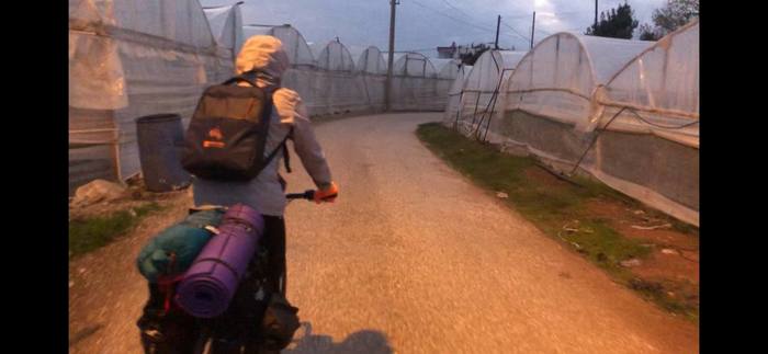 С самой верхней точки открывался прекрасный вид на закат, море и теплицы рядом с Кумлуджей и Финике. Пофотографировав, мы начали спуск вниз. Асфальт опять испортился, дорога в данном месте ремонтируются. Машины, кажется, тоже активизировались. Турки должны успеть добраться с работы и купить продукты перед локдауном в выходные. А у нас оставалось около 1.5 часа светового дня. почти 600 метров высоты, которые мы набирали так долго сейчас улетят за 12 км. Рядом носятся трактора и машины, на обочине мелкие камни, ехать страшно и не приятно. Груженные велики еле еле тормозят с нашими ободными тормозами. Несколько раз останавливались, так как пальцы уставали давить ручки тормоза и кисти, в целом, уставали от тряски.
