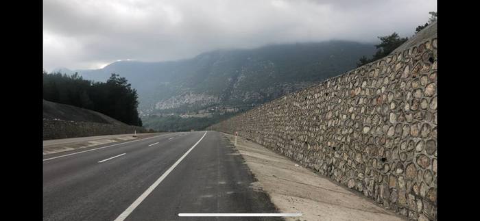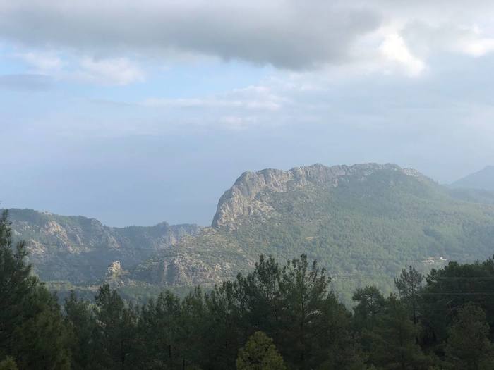 После начинается отличное шоссе. Так же очень радуют красивые виды вокруг. Эти места обожают любители горного туризма - здесь проходят тропы ликийского пути. Проехали мимо поворота на Янарташ - огненную гору. Мы там уже были в октябре, поэтому смело пропустили (спускаться на 500 метров лишний раз - не вариант). Наблюдали в этом месте много туристов с походными рюкзаками. Видимо, добираются в Чиралы и на Химеру. Вокруг невероятные виды на горы. Пару месяцев назад я проезжал здесь на машине в обратном направлении. Мысль о том. что здесь я буду ехать на велике показалась бы тогда дикой. Сзади нас сгущались тучи.