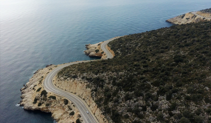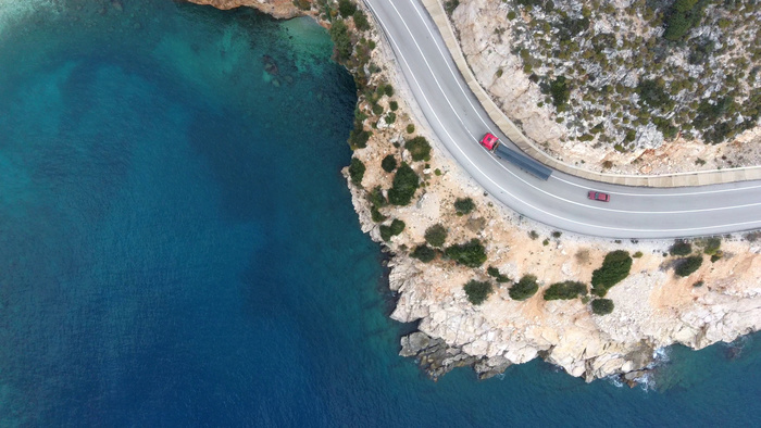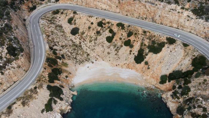 в подобных местах удобно просматривать пути - из далека видно есть ли машина впереди - сзади. Сегодня у нас запланировано 35км и всего-то 300 метров подъёма, ерунда после вчерашнего ада. Дорога сегодня не поднимается высоко, так как едем по изрезанной набережной. Выходные, карантин - машин мало и это прекрасно. Ехать сегодня немного - делали стоянки в своё удовольствие, снимали и летали.