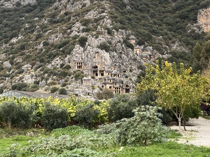 Посмотрели на Миру. К сожалению вход в выходные закрыт. Правее некрополя располагается громадный амфитеатр , почти не видно на фото. Как выяснится позже, это остатки города древней Ликии. Саркофаги имеют свой уникальный стиль. В последующие дни мы увидим ещё много подобных сооружений. Но они всегда восхищают!