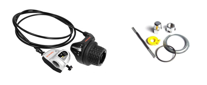Минеральное масло для цепи грамм 50. Парочка надфилей. Крепёжные материалы - скотч, изолента, стяжки. Просто болтик М5 с десятком различных шайб и гайками. Запасные гайки на ось колеса, стопорная гайка и штырек для планетарки, стопорное кольцо ведомой звезды. Запасные камеры под наши колёса. Ободная лента. Запасные тросики - один для тормозов и ещё один для переключения передач. Запасные колодки - 1 набор.