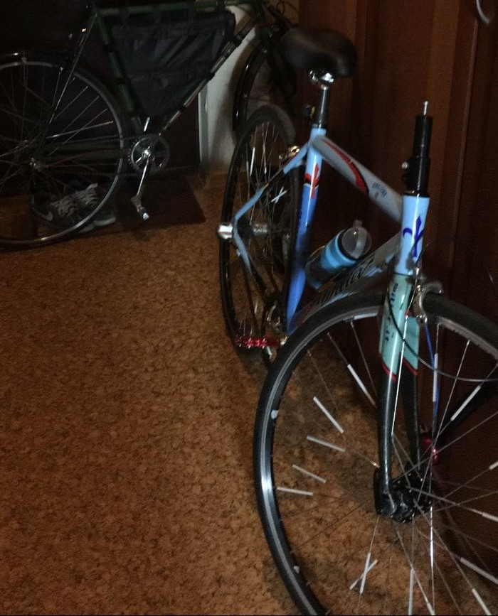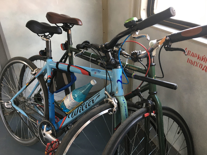 Раскладка на велосипедах - Два велика, на каждом велоштаны, кое что распихано на раме (насос, фляжка) , что-то в велосумках. С собой два рюкзака - для перевозки ноутов и походов в магазин.