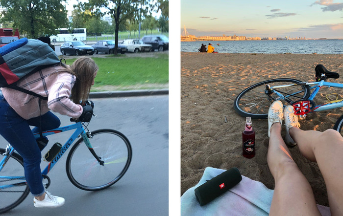 Мы изучили местные велодорожки, покатались по набережной. Было интересно объездить знакомые места. Город будто бы стал небольшим, всё стало ближе. До этого мы много ходили тут пешком и ездили на общественном транспорте. Это занимало много времени, т.к. расстояния относительно большие, автобус иногда ждёшь минут сорок. Ездить в трамвае-автобусе минут по было 25 долго и скучно.