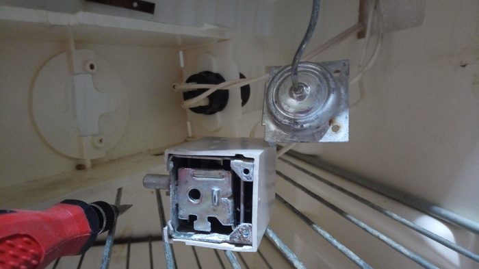 Последние пару месяцев морозилка стала быстро намораживаться, приходилось через неделю-две оттаивать и мыть. Сразу стало понятно, что проблемы с терморегуляцией и что белому другу приходит кирдык. В один прекрасный момент он не включился после перерыва в работе. Пощелкала немного круглой ручкой с циферблатом - с нуля на единицу, с десятой попытки мотор завелся, но после первой же остановки снова не включился. Поняла, что проблема именно в этой коробке, в которой (как позже выяснилось) находятся температурный датчик и термостат (или терморегулятор, до сих пор не пойму как он правильно называется), причем представляют они собой одну единую собранную штуку, которая меняется по тому же принципу, как смеситель в ванной: весь старый убираешь, новый ставишь.