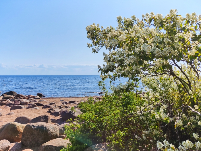 К пляжу мы шли мимо высоченных сосен, которые росли на утёсе. А с него открывался вид на озеро - такое голубое, такое прозрачное. Вот только слепни очень отвлекали...