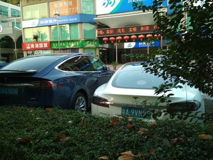 Внезапно возле какого-то банка встретили клуб по интересами - 3 Теслы, золотая в кадр не влезла, чуть поодаль стояла.