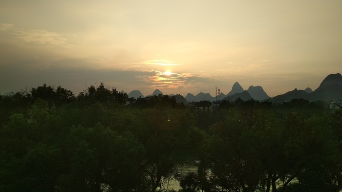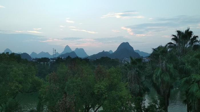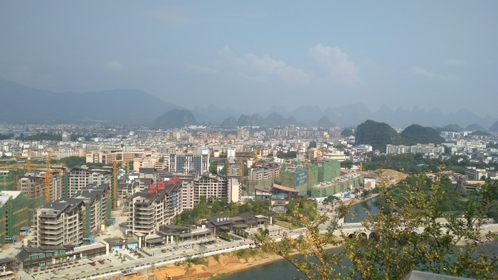 Река, плоты, карстовые горы – это всё, конечно, красиво, но в прошлую поездку я уже всё это видела, поэтому вау-эффекта не было. Походили-побродили по окрестностям, прикинули, куда рванем завтра с утра, и к вечеру пошли в сторону горы Лаожай. Удивительное рядом – гора в шаговой доступности от набережной, оттуда открываются ошеломительные виды, пешеходная тропа наверх относительно благоустроена – и в то же время китайцы не берут за проход денег. Подозреваю, что через год-два ситуация изменится, такой стартап пропадает. Неподалеку расположенную гору Сянгун уже монетизировали, да и Лунный холм тоже.