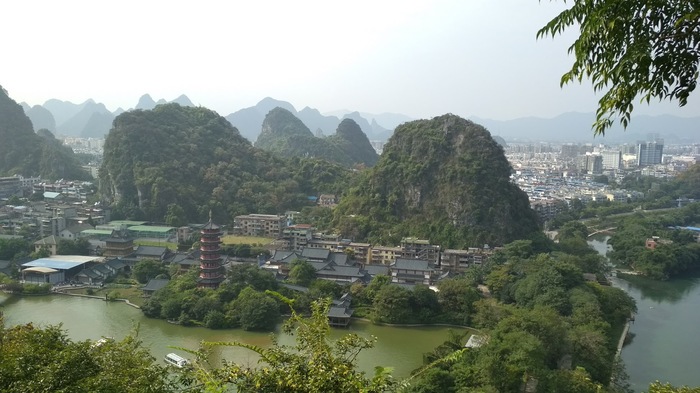 По приезду в Гуйлинь мы пошли в парк Diecai, но по дороге немного заблудились и в итоге сначала обошли его по кругу снаружи, а потом только попали вовнутрь) Парк неплохой, вход 32ю, провести там можно несколько часов легко. Есть разные пагоды, гора с видовой площадкой, развлекухи типа скатиться вниз по метал.желобу. Вот немного фотографий оттуда, на первой в центре вдалеке видна гора Слоновий хобот, можно в инете нагуглить, как выглядит вблизи. Тоже место популярное у туристов, но мы туда не пошли принципиально - проход платный, только ради того, чтобы сделать фотку на фоне горы, больше ничего интересного там нет))