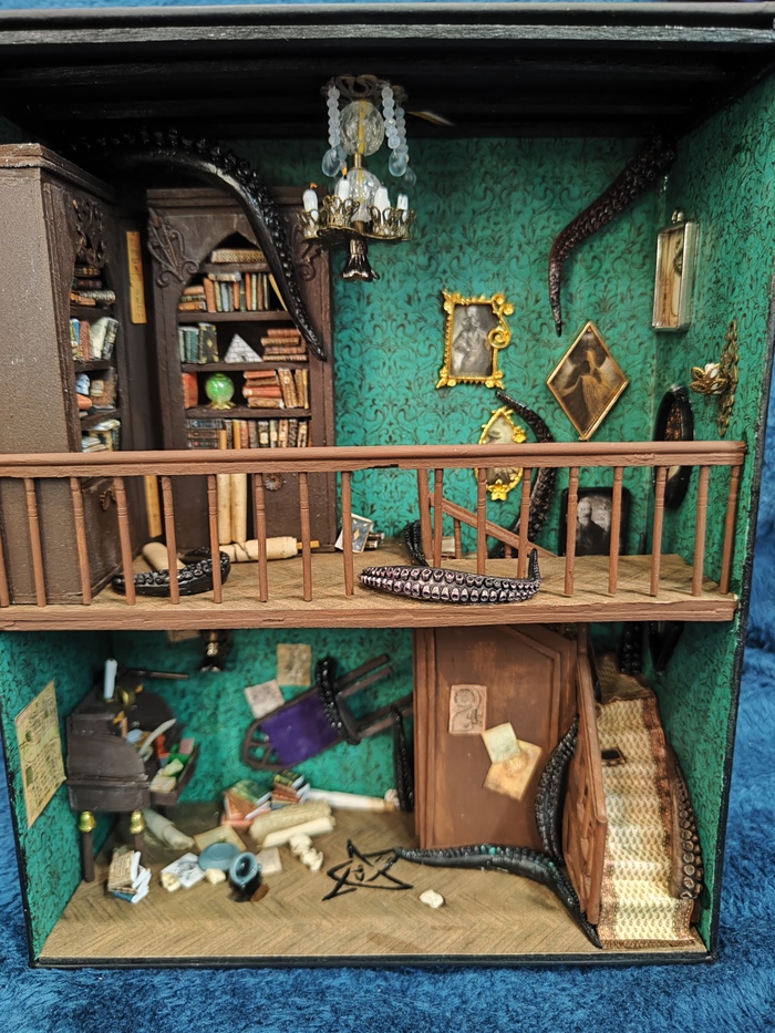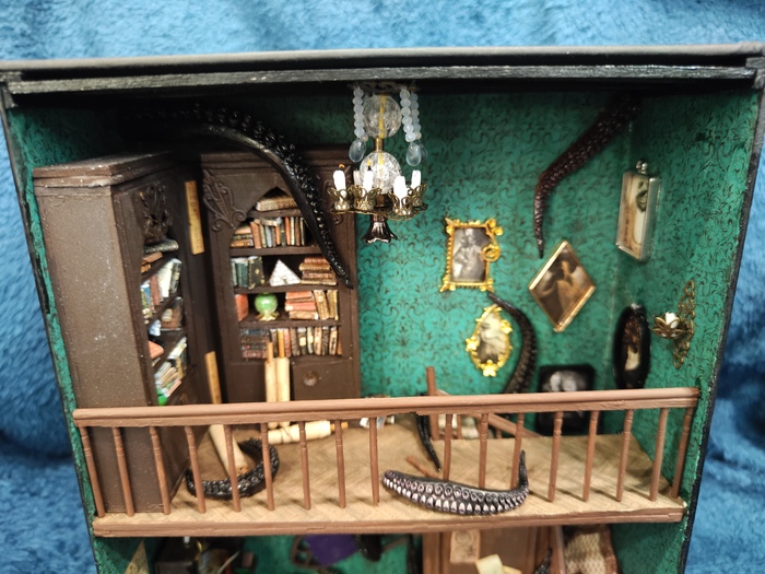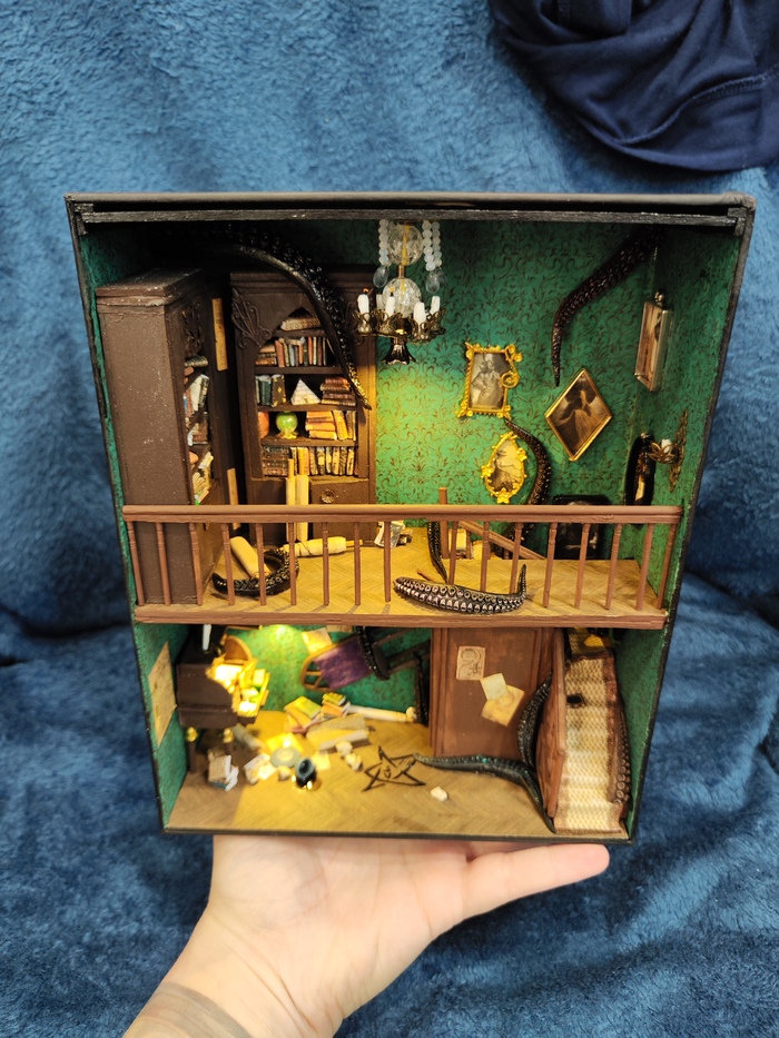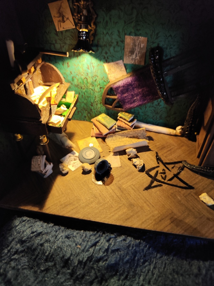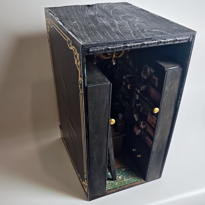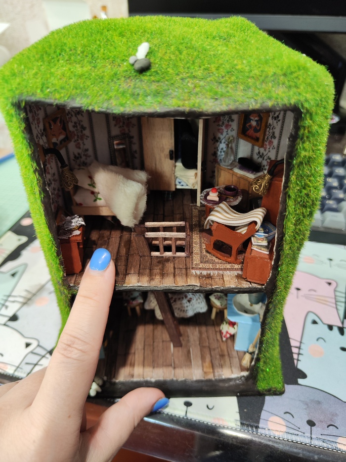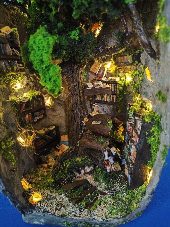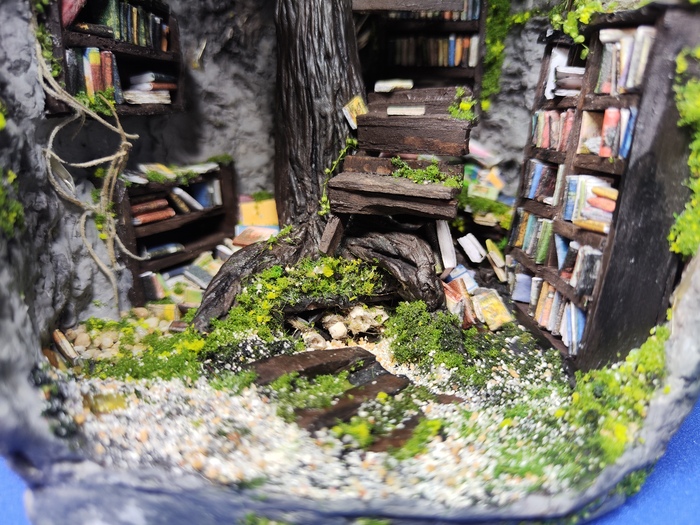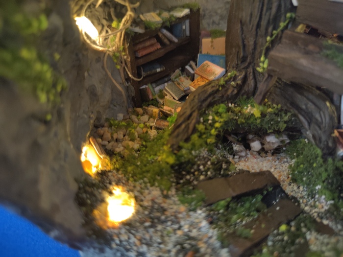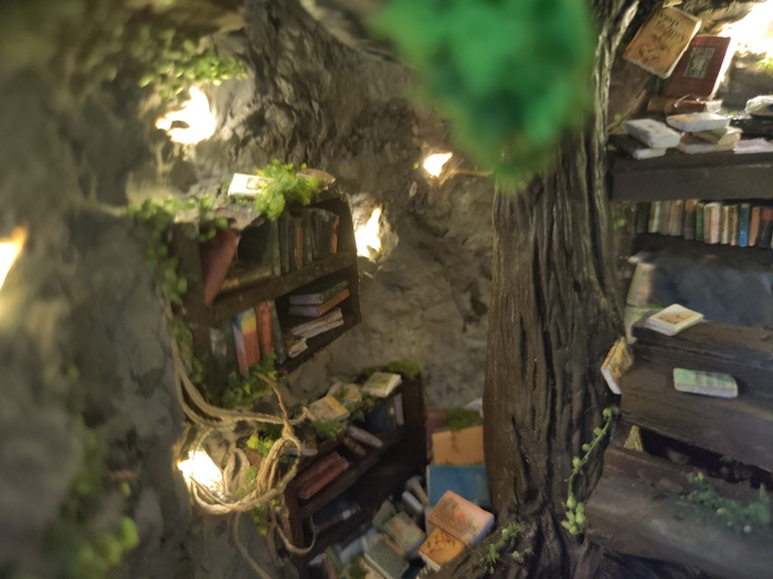 Натворилась у меня такая вот диорама, можно сказать, лесная библиотека) В голове крутилась история про ребёнка-подмëныша фей. Согласно, некоторым легендам феи могут выкрасть младенца у людей и заменить ребёнком феей. И вот росло дитя, чувствуя себя чужим в людском мире, а когда ребёнок подрос, ушёл в лес, чувствуя, что найдёт там что-то важное. Блуждая по чаще леса, он нашёл разрушающуюся от времени башню-библиотеку, которая поросла мхом, а посередине даже выросло могучее дерево. В этой башне подмëныш и узнал, кем является на самом деле.