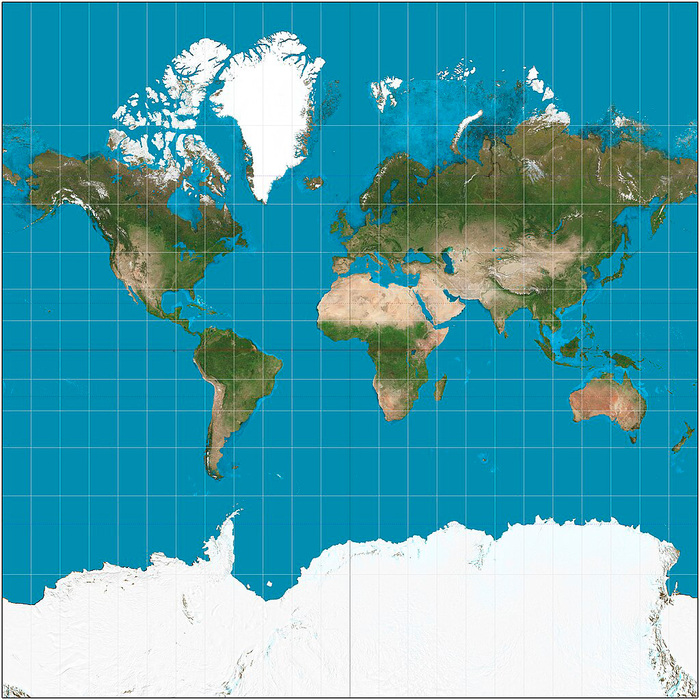 Карта мира в проекции Меркатора. Благодаря этой проекции жители Гренландии думают, что их остров больше в 2 раза, чем Австралия возможно, @Gagarra тоже.
