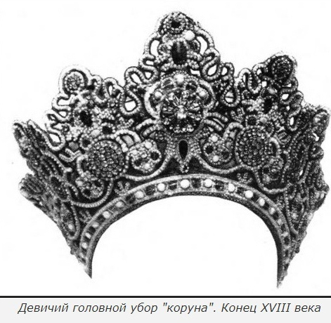 Девичьи головные уборы разнообразны по формам: северные - в виде зубчатых венцов, широких твердых обручей, высоких повязок. Сзади они скреплялись двумя широкими полосами узорной шелковой ткани, или перевязывались широкой лентой, украшенной по краю золотным кружевом, мишурным галуном. Как и кокошники, они украшались жемчугом, перламутровыми плашками, золотной нитью, фольгой.