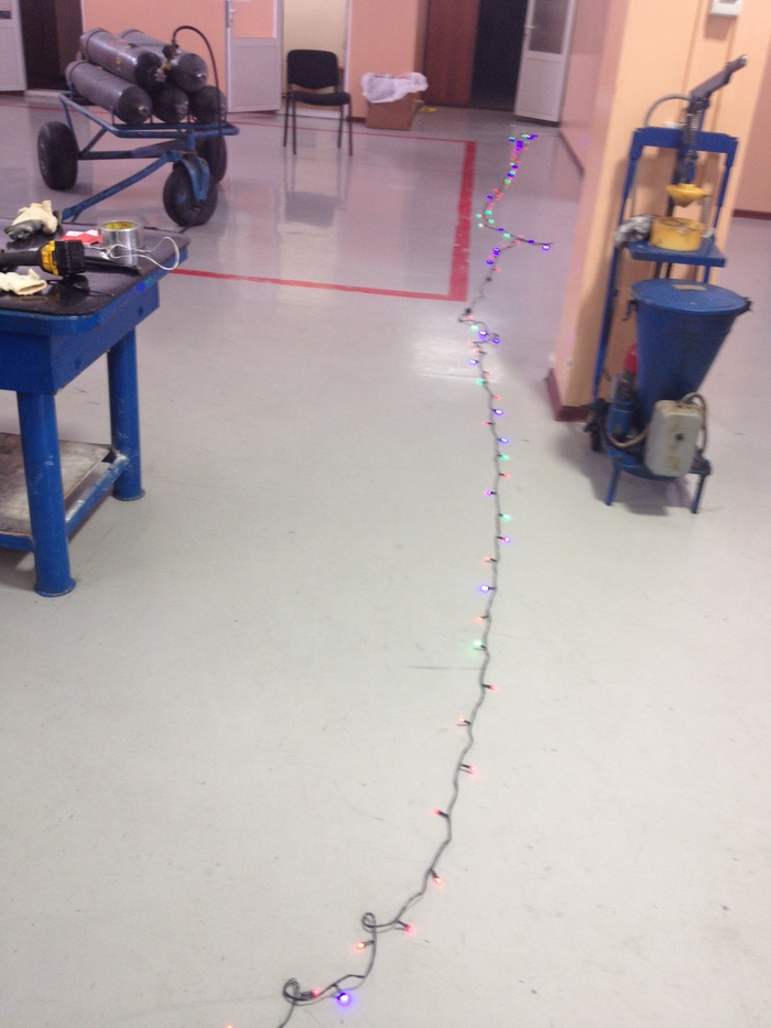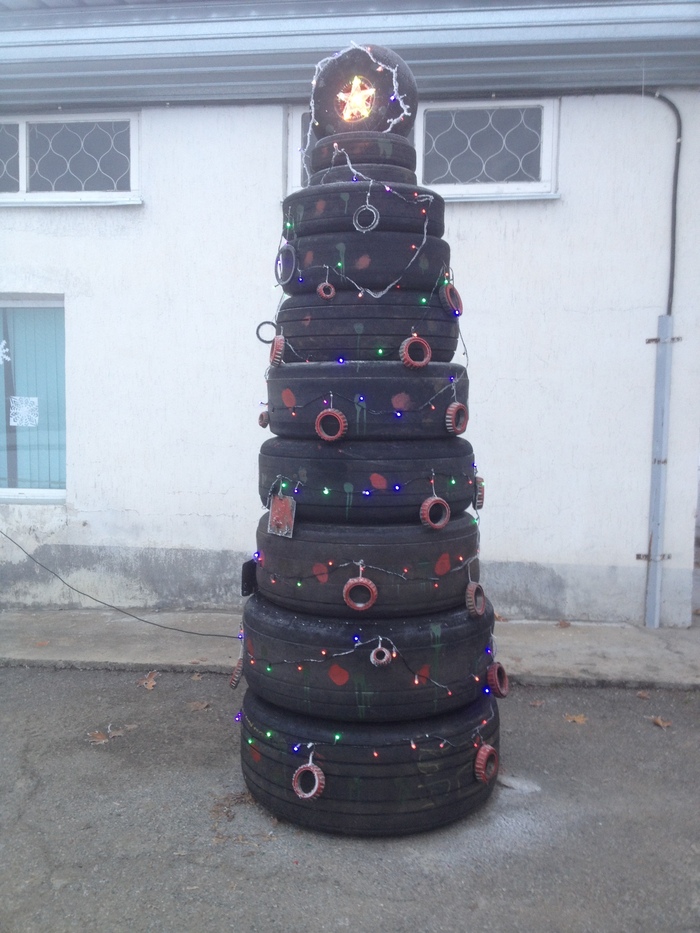 Насмотревшись, разных ёлок из автомобильных шин, решили соорудить свою из авиационных каркасов. В ход пошли каркасы колес от воздушных судов Boeing 767, 757, 737CL, 737NG, Bombardier CRJ-200, CRJ-700, а также Ан-2. Дабы не нарушить концепцию, вместо новогодних игрушек в ход пошли подшипники, обтюраторы.