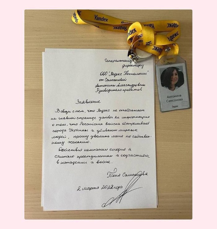 "В связи с тем, что Яндекс не отображает на главной странице yandex информацию о том, что российские войска обстреливают города Украины и убивают мирных людей, прошу уволить меня по собственному желанию. Действия компании сегодня я считаю преступлением и соучастием в нападении и войне", - написала журналистка и основательница проекта Яндекса The Question.