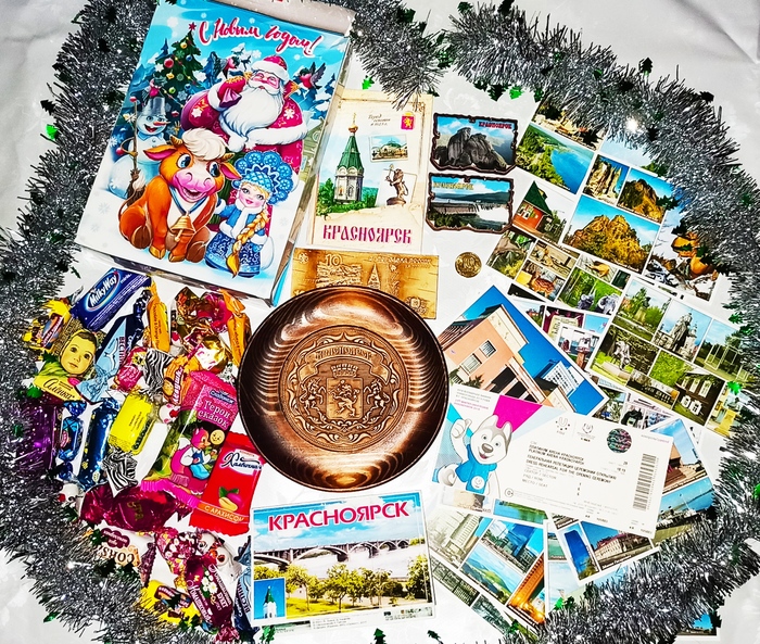 Усиленно работая после праздничных выходных, наконец-то получила заветное оповещение, что моя посылка на почте!!!Эти пару часов длились целую вечность))) отстояв на почте приличную очередь, в предвкушении несла посылку домой! Вначале думала открывать на Старый Новый Год, но что-то пошло не так, и вот я сижу и разматываю бережно упакованный пакет, а дальше.... , как в тумане) мой Дед Мороз Максим учёл все мои пожелания, и даже больше! Подарком осталась очень довольна! люблю милые вещи, сувениры, магниты, понравились открытки с описанием главных достопримечательностей города, сразу же начали их изучать, хотелось бы и посетить прекрасный город Красноярск, но это уже после открытия границ. Отдельное спасибо за памятный билет и монетку!!!!для меня это очень ценный подарок, это круто! Ну и конечно же спасибо за вкусные сладости!!!