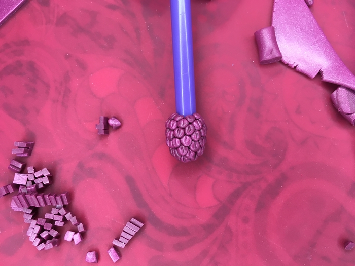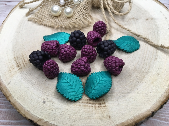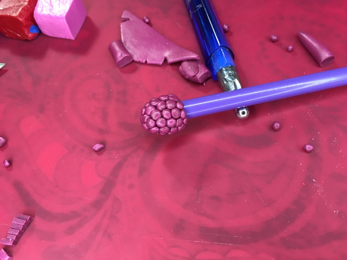 Малинка делается очень просто, катается много маленьких шариков и крепится на основу. Так делаем 10 ягод малины и отправляем запекаться следуя указанию на этикетке полимерной глины.
