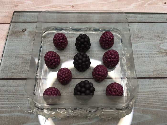 После запекания ягодки креплю к стеклу на термоклей. Покрываю заготовку восковым разделителем. Замешиваю силикон и заливаю в форму. Жду сутки.