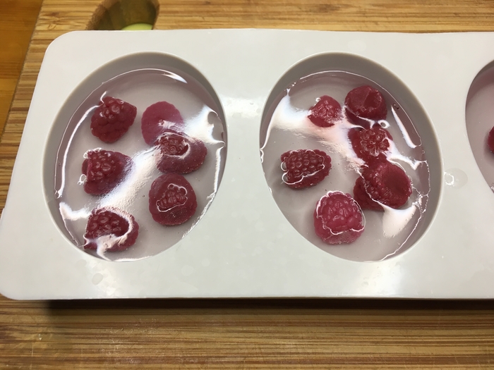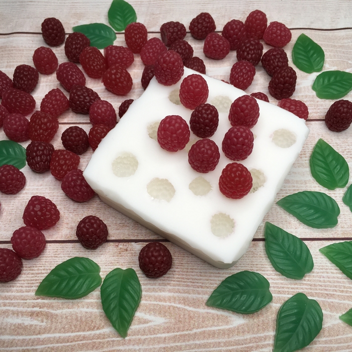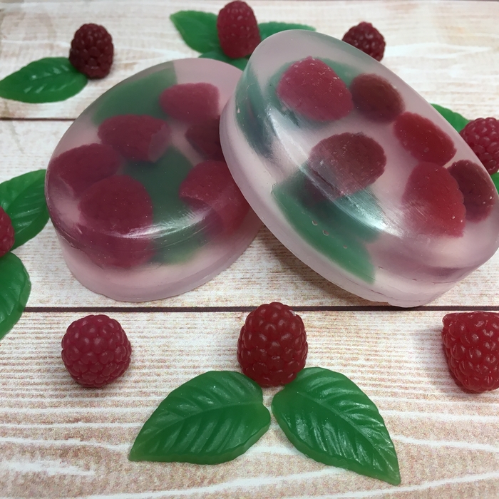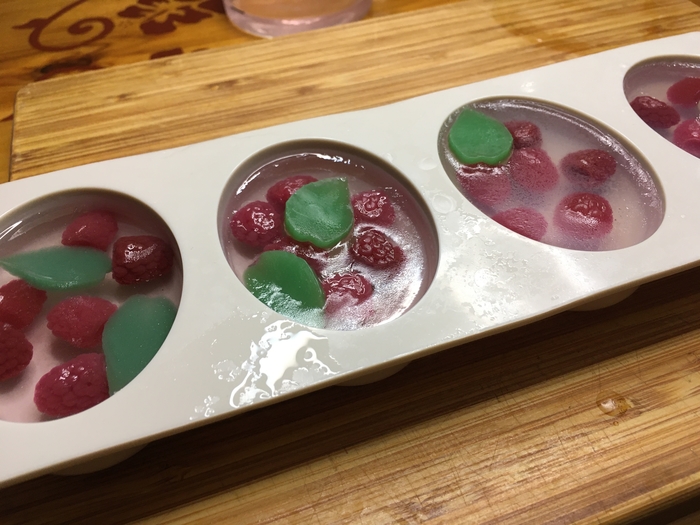 После заготовки ягод беру прозрачную мыльную основу, добавляю краситель, столько, чтобы был лёгкий малиновый оттенок, и вплавляю ягоды в основу. Ну и добавила листков для цвета