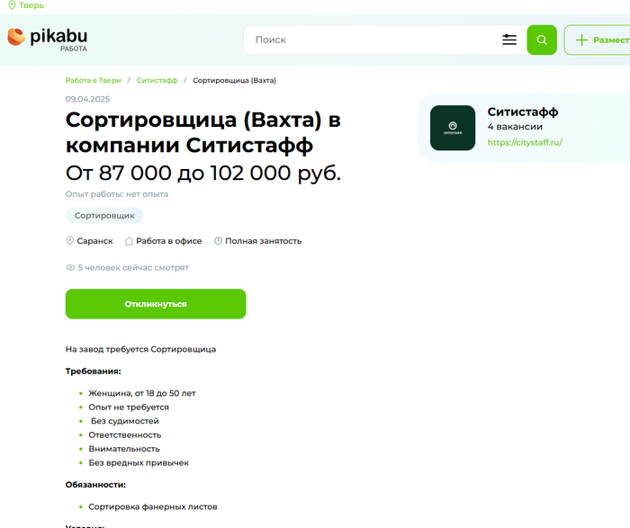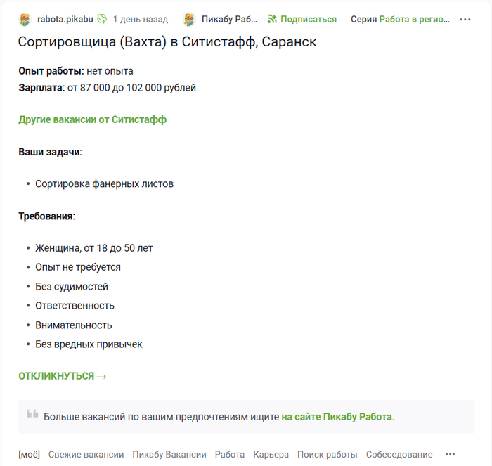 Обычно не обращал внимание на проплывающие в ленте вакансии от Пикабу, но тут решил вчитаться. При переходе по ссылке указано, что работа в офисе (сортировщица это как)? Почему именно женщина, чем работодателю страшна судимость, а если погашена? Чем на рабочей должности помешают вредные привычки. Почему нельзя курить или грызть ногти?