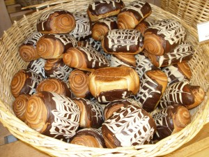 А дальше после обеда спокойный размеренный день, хлеба, багеты нарезка, иногда кондитер подвезет слойку(с ней ничего делать не надо, расстоял и в печь) или пироги(мясной или рыбный) их мы смазывали яйцом, еще ромовую бабу тоже подкидывали, её правда из формы после выпечки надо доставать, а так ничего сложного. А да иногда кондитер подкидывал свадебные караваи, это чаще заказные, и веса в них было до 5 кило.