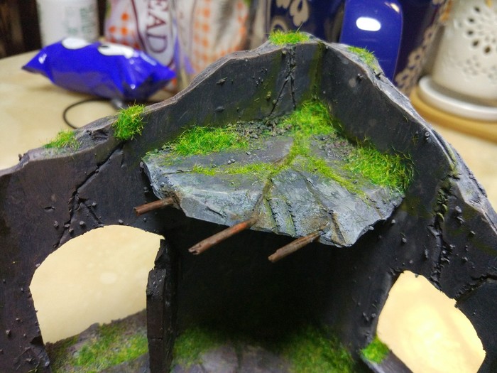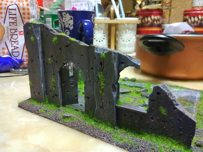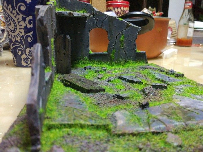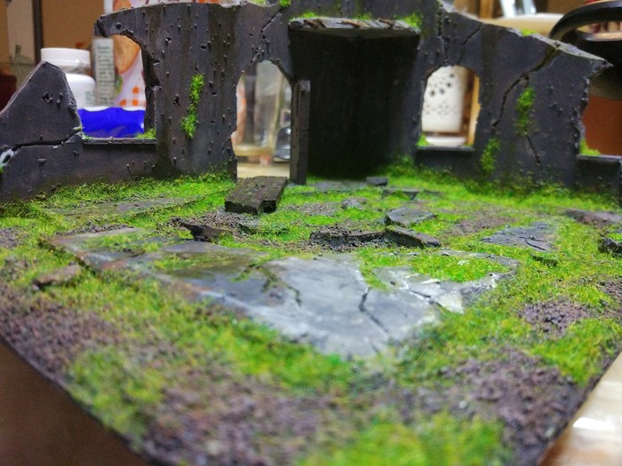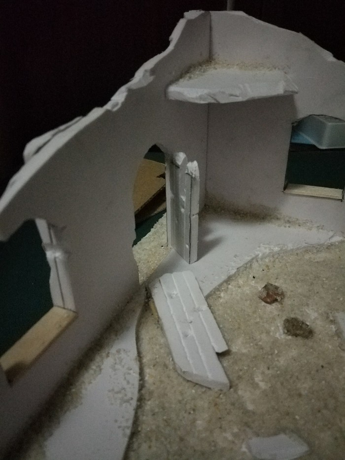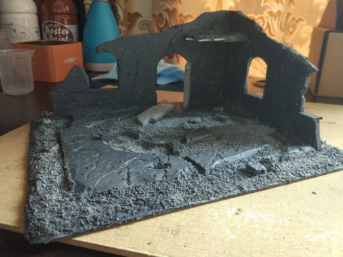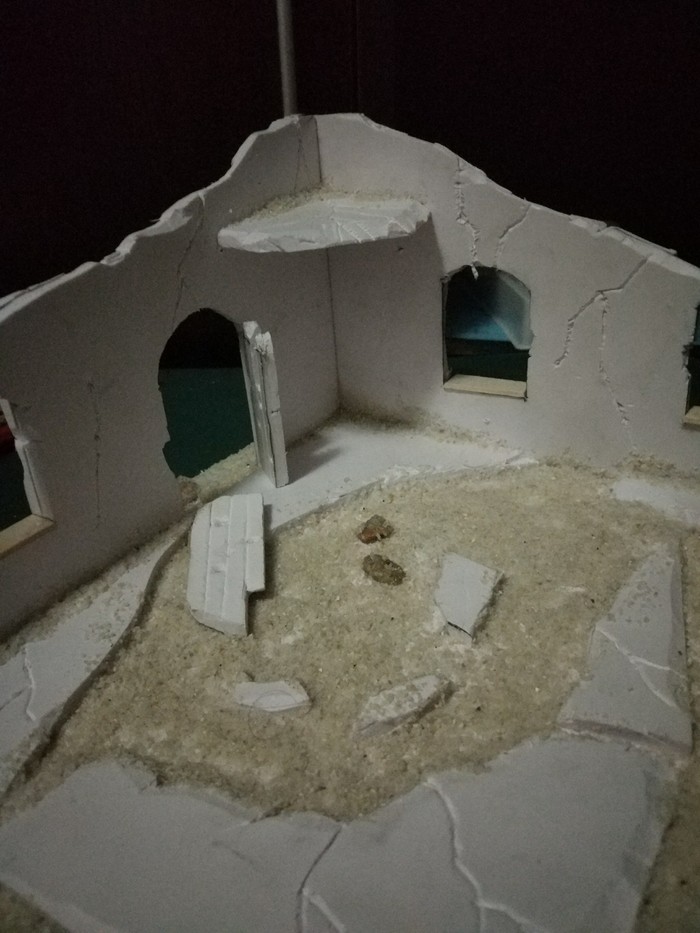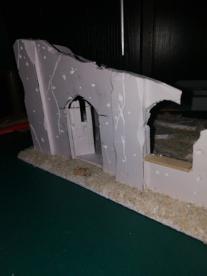 Когда все из упомянутого будет сделано, в рандомном порядке приклейте камни и остатки стен, после чего обмазываете все клеем ПВА (те места, где вы хотите иметь песок) и посыпаете песком. В углах концентрация его обычно больше.
