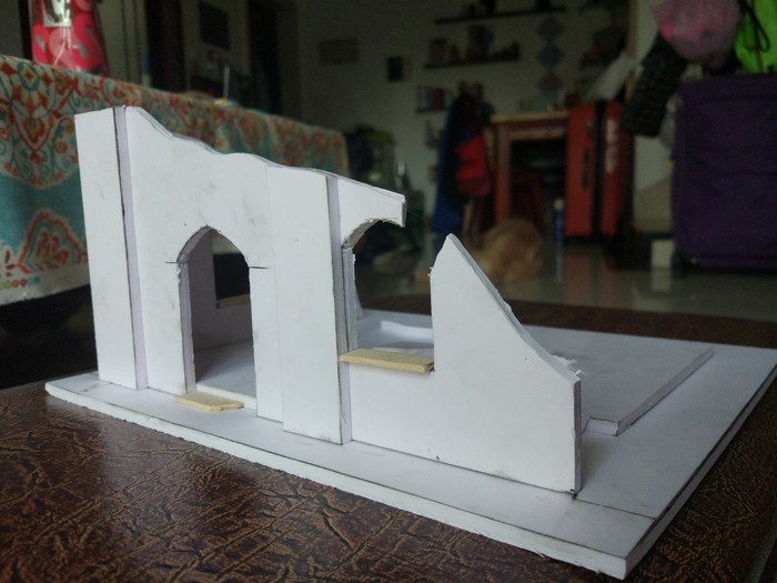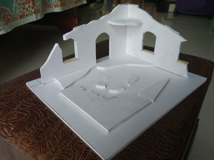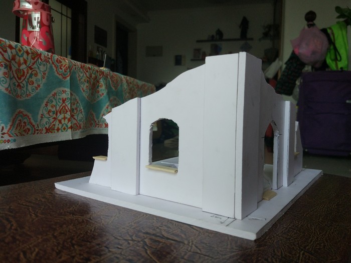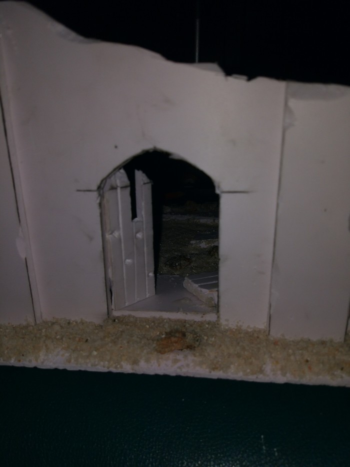 Далее приходим к осознанию, что руины не любят углы и прямые линии поэтому аккуратно срезаем углы и вообще все прямое и доброе. После этого шилом или тем же канцелярским ножом проделываем пулевые отверстия разных размеров и пилим трещины. По желанию из того же материала, что и стены можно выполнить дверь и из зубочисток сделать косяки. Так же в зону второго этажа можно воткнуть зубочистки, олицетворяющие арматуру от обвалившегося пола.