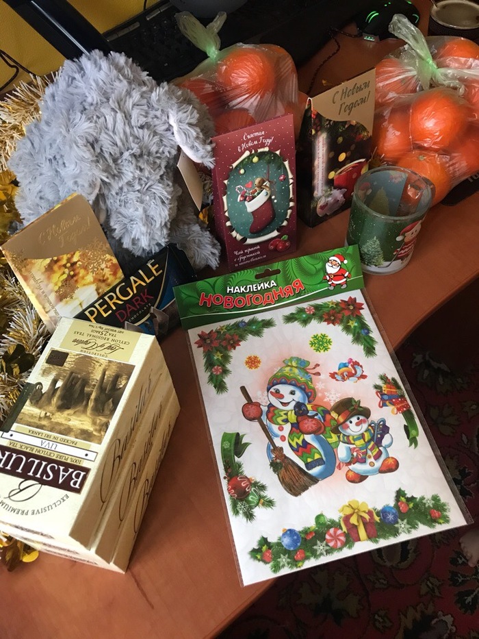 Килограмма два отличных мандаринов (обязательно оставлю три штучки на Новогоднюю Ночь), огромный запас чая, кружка с хрюшей, темная шоколадка (люблю шоколад) и новогодняя наклейка!