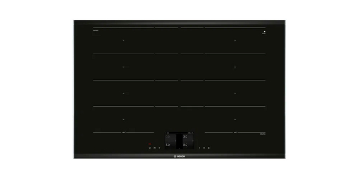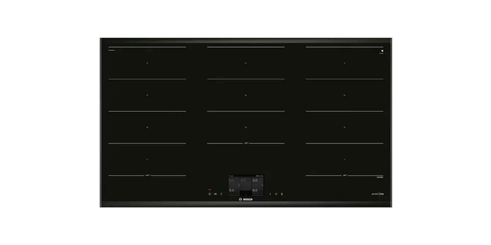 Продолжает топ премиальная индукционная панель из серии Serie 8, созданная для тех, кто ценит комфорт и безопасность при готовке, особенно подходящая для большой семьи. Панель размером 91.6 см выполнена из стеклокерамики SCHOTT CERAN® со скошенными краями и боковыми профилями из нержавеющей стали, что придает ей стильный и долговечный вид.