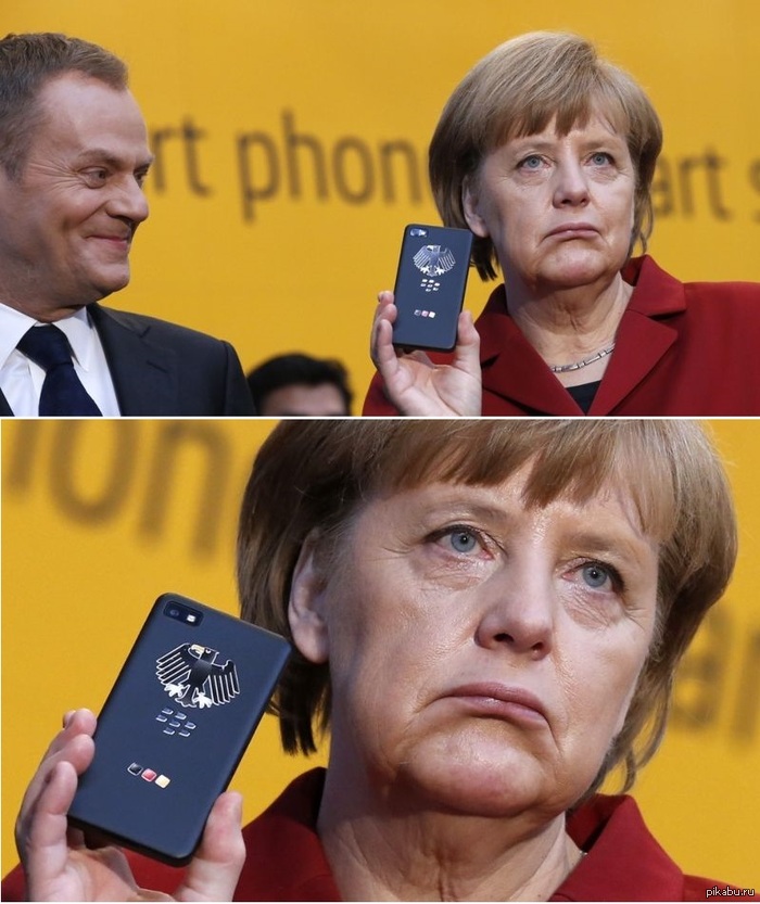 124 Teker Ангела Меркель посетила немецкую техническую конференцию 12 лет назад Где ей вручили новую сверх-защищенную версию смартфона BlackBerry. Судя по выражению лица, канцлер не в восторге от новинки. Негодование Технологии
