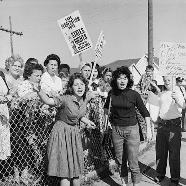 7. У мальчика плакат: "Все, что я хочу на Рождество - чистую белую школу" - протесты после того, как темнокожая девочка Руби Бриджес первой начала посещать школу для белых, Новый Орлеан, 1960 год