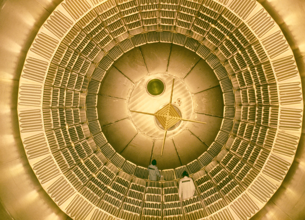 7. Двое техников внутри топливного бака космического корабля Спейс шаттл, 1985 год