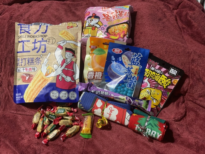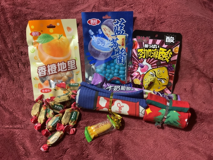 И соответственно вот тут я хотела бы уточнить насчет спорности подарка. По идее, то что осталось - вполне норм. Носочки милые, полотенчико передано бабушке и после стирки будет висеть на кухне. Конфетка с кукурузой ОЧЕНЬ вкусная (завидую тому, кто выкладывал горку таких в своей посылке, буду искать их в мск).