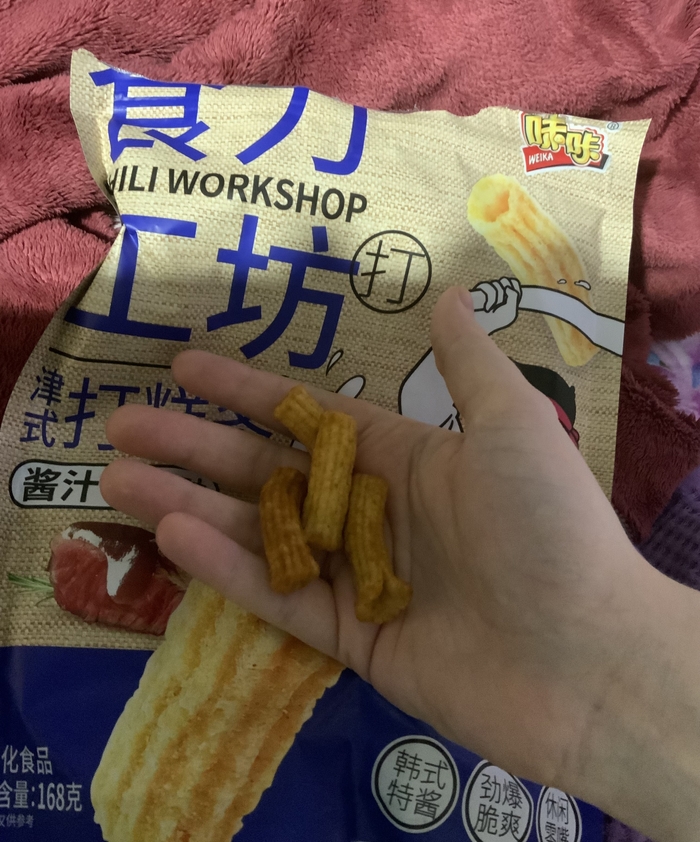 Дальше прогуглила про чипсы (с парнем на упаковке), нагуглила по фото, что они кукурузные. Обрадовалась, попробовала. Они НЕ-РЕ-АЛЬ-НО вкусные!!! Не просто посыпаны специями, а именно в карамельном остреньком соусе со вкусом мяска: